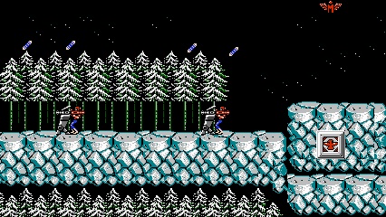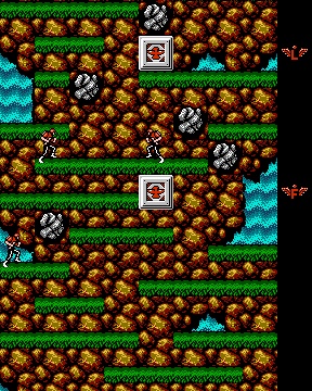 瀑布中打开花弹的士兵不能被击毙。特别注意,由于关卡具有单向前进性,本关的所有跳台在画面下方消失后即不复存在,视作悬崖处理。