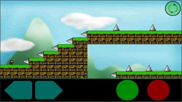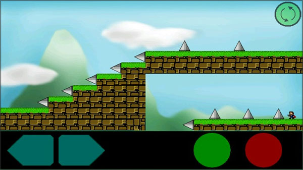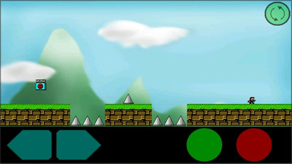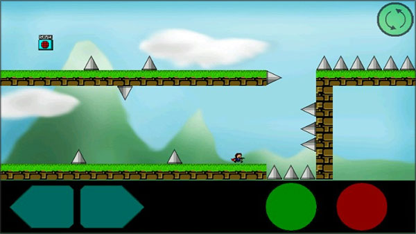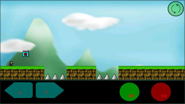 2、使用左边两个按钮控制角色左右移动,点击绿色按钮进行跳跃、红色按钮进行发射子弹。