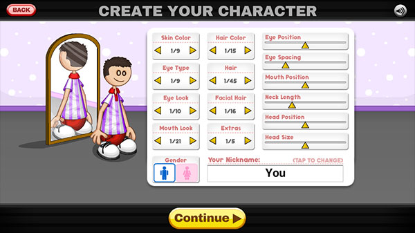 2、您可以选择扮演Penny或Alberto,或者您现在可以设计自己的自定义角色以在Freezeria 中工作!创建一个男孩或女孩,拥有数十种发型、头发颜色、肤色和面部表情。你甚至可以调整你的头部大小、颈部、眼晴和嘴巴的位置,使你的角色看起来恰到好处。