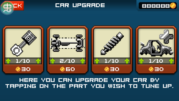 最后值得一提的是,本作没有任何内购,金币的收集也非常容易。尽管关卡解锁,新车的购买和升级都是一笔开销,但只要稍微给点耐心就能够体验完所有的游戏内容。
