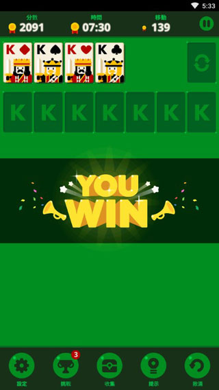 期间游戏在下方还为提供了挑战、收集、提示和撤销功能,达成各种成就任务,收集各式各样扑克牌皮肤主题样式,享受成语接龙带来的无限乐趣。