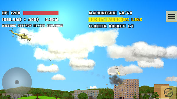 - 在不同的建筑物上射击你的火箭,看着它们倒塌。