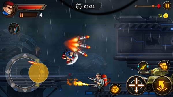 在勇士冲冲冲中,玩家滑动虚拟摇杆可进行移动或瞄准,点击跳转按钮跳跃障碍物,点击按钮进行射击或者使用手榴弹进行致命爆炸,绽放出华丽的战斗火花。