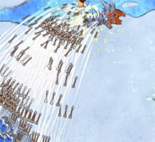 远程攻击的选择,当然也是靠左面放,首选弓,占人口少、攻击高。其次是投石机,切忌用弩车,弩车有击退功能,一个击退,猩猩的攻击方向可能就会变,一个地图炮就能带所有远程走。