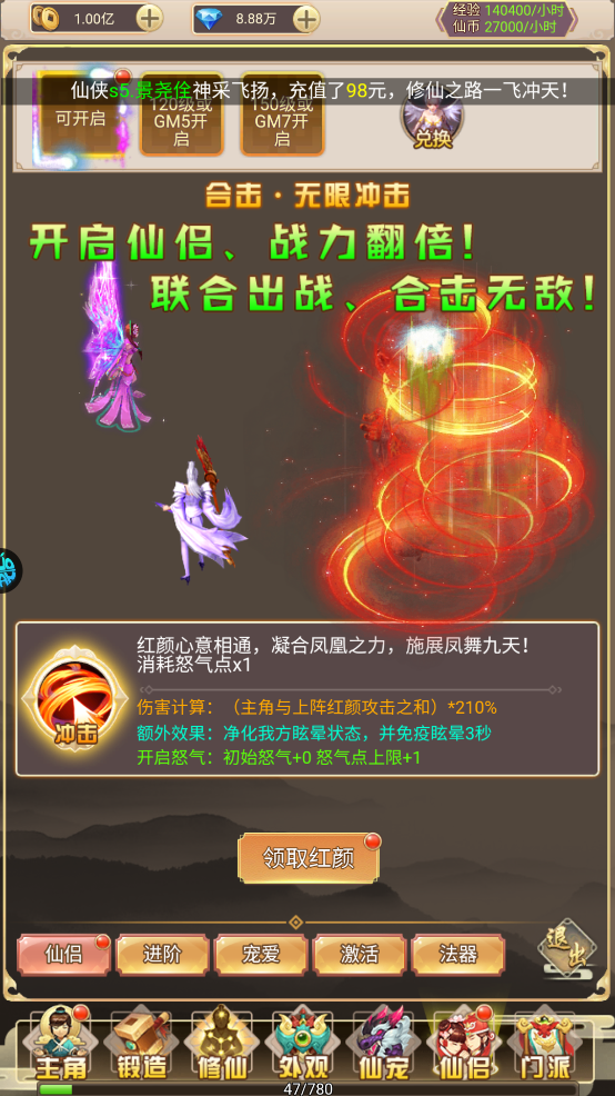 全新仙侣系统,开启仙侣,战力翻倍;联合出战,合击无敌。