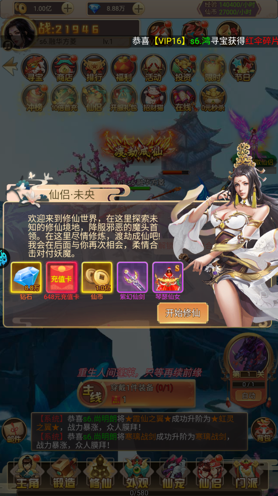 1、丰富的福利:上线即可获得648充值卡,直接领取紫幻仙剑,琴瑟仙女免费送。