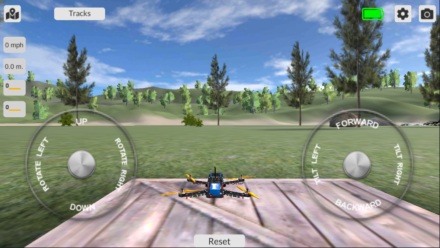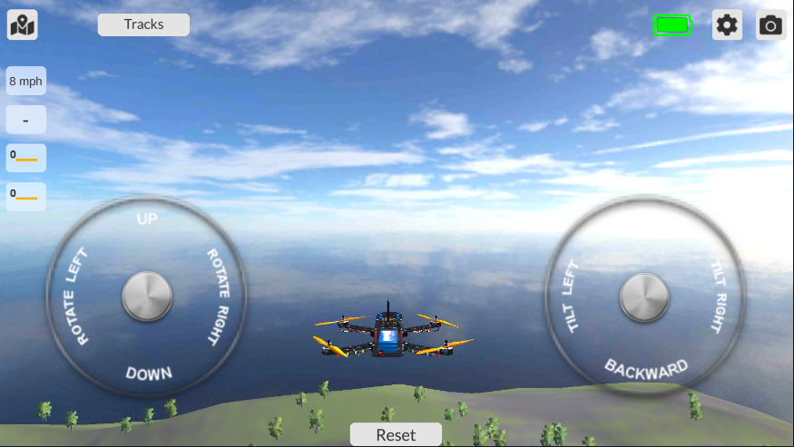 3、操作非常简单,左边控制无人机飞行的高度和行驶方向,右边则是控制飞机的左右侧翻,点击右上角的相机可以查看周围的情况