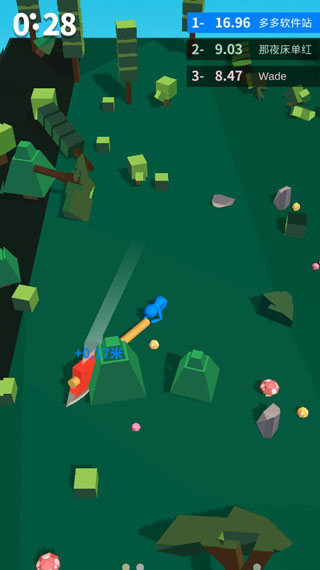 对于游戏玩法来说,还是比较简单休闲的,开局一把刀,后期也不一定是刀,有斧头、大棒等等都有可能,在这个局限的世界中不断的进行劈砍,无论是砍树还是砍人都能够增加你刀的长度,其中砍人会增加的比较多,砍树比较少,在2分之内,没有阵亡的玩家谁刀更长谁胜利。