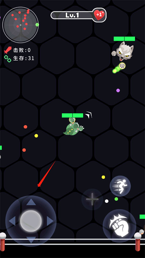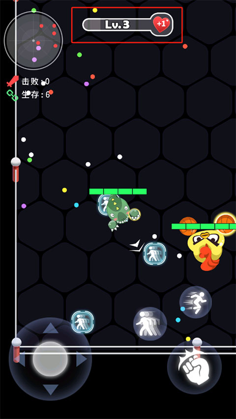 操作也挺简单的,左边是摇杆控制移动和方向,关键时刻可以用技能加速,攻击键打对手。还有等级条,等级越高体型越大,玩起来特别有成就感。升级还能提升伤害,每次游戏结束都有经验奖励和金币奖励。
