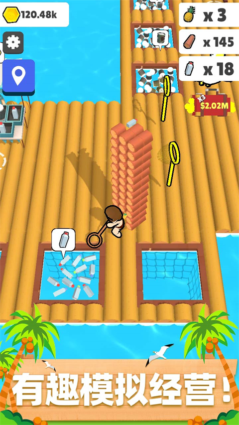 这是一款深受上班族喜爱的游戏。玩家需要在木筏上收集木材,出售换取资金,并通过不断扩展领土来解锁更多奖励。游戏采用俯视角卡通画风,这一设计既降低了操作难度,又为不擅长3D视角的玩家提供了友好体验。