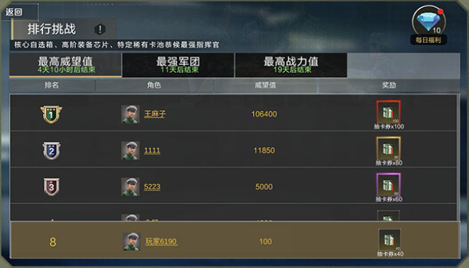 根据活动规则,限定在不同时间,结算服务器内【威望值、【军团势力值】、【玩家单队最高战力】的前X名,发放排名奖励。奖励包括【抽卡卷、高阶芯片、特色卡池】。