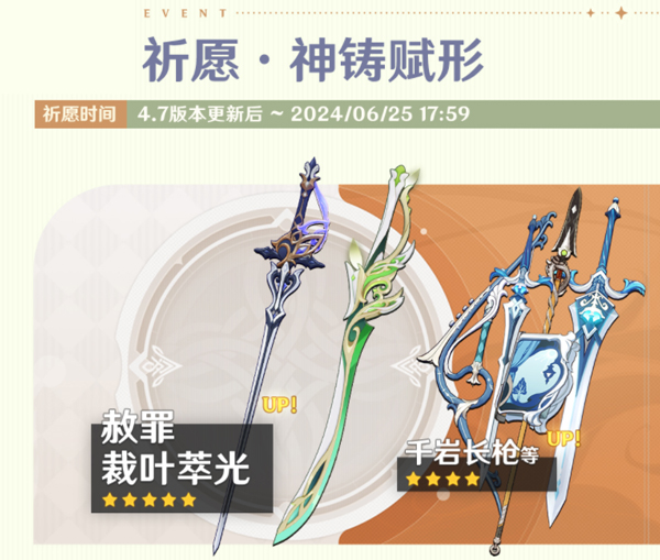 ◆活动祈愿「神铸赋形」期间,限定五星武器「单手剑·赦罪」祈愿获取概率将大幅提升!