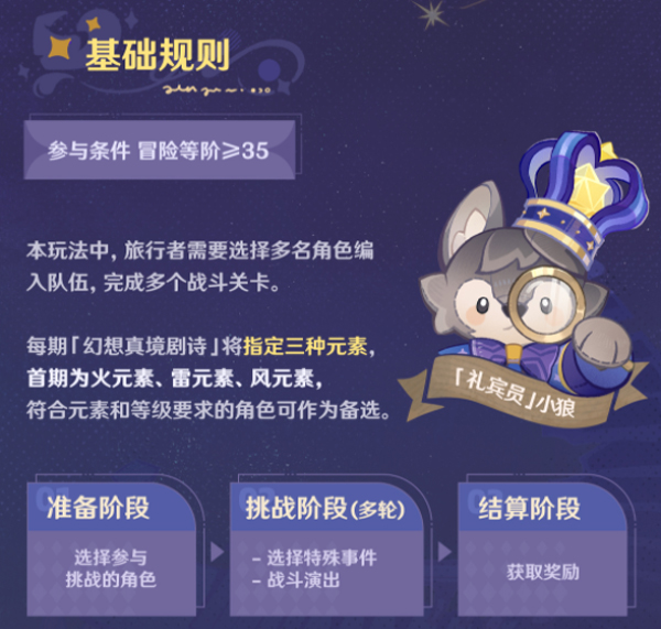 每期「幻想真境剧诗」将指定三种元素,符合指定元素和等级要求的角色即可加入队伍。