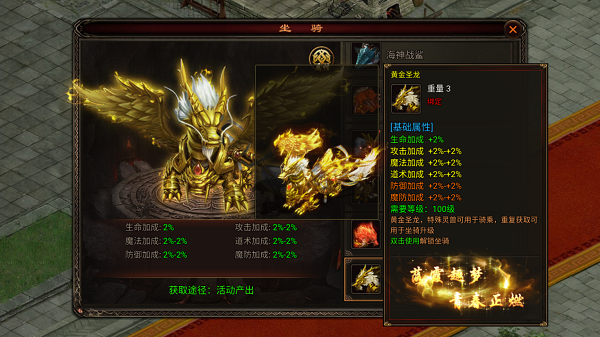 坐骑重复获取可用于坐骑升级。强化坐骑可提供高额攻血防、骑乘时移速增加,驰骋八方!