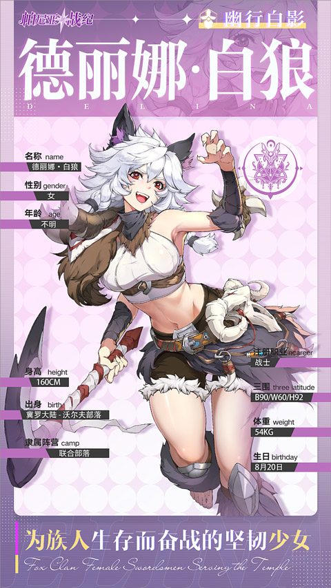德丽娜是沃尔夫部落白狼族的现任首领,因为过去兄长和族人战死于沙场的原因,她背负了整个白狼氏族,为了族人的生存,同时也为了寻找为兄长报仇的机会不停地奋战着。