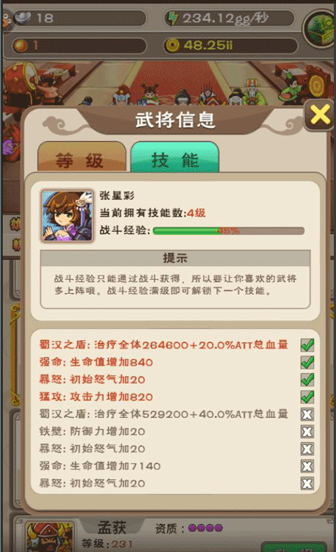 武将系统:在武将界面可以提升武将的等级。一,与兵种相比武将一个巨大的优势就是攻击力高。于此同时战斗时小兵还不怎么喜欢打武将,因此提升武将等级可以很快的提高DPS。二,每一个新解锁的武将都有很高的初始等级。所以玩家们要尽快完成一个州的攻占哦。另外游戏中还有武将计的设定,每个武将都有各自的武将计,不过这个武将计暂时只能花钱购买。