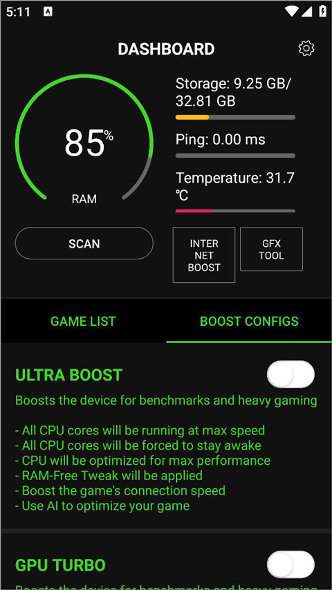 3、自动游戏模式:自动配置Game Turbo和游戏调谐器的所有设置。