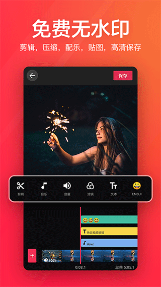1、免费无水印:剪辑,压缩,配乐,贴图,高清保存2、拼接&剪切:拼接多个视频,剪辑剪切视频,简单易用3、滤镜&特效:添加电影特效滤镜,制作电影级别短视频4、配音配乐:动感场景音乐,为您的视频增添乐趣5、视频压缩:选择分辨率来压缩和转换视频功能介绍