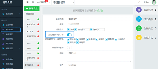 2、食堂信息,食堂的基础信息处,开启“是否允许外部订餐”。