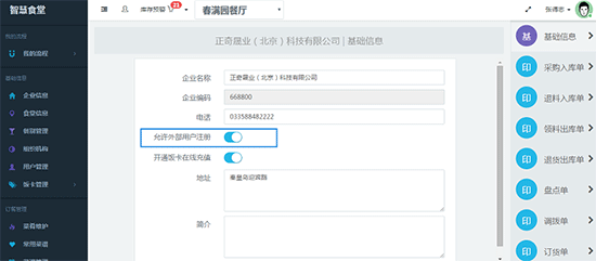 1、在系统内企业信息处滑动“允许外部用户注册”按钮,使之处于开启状态,保存。
