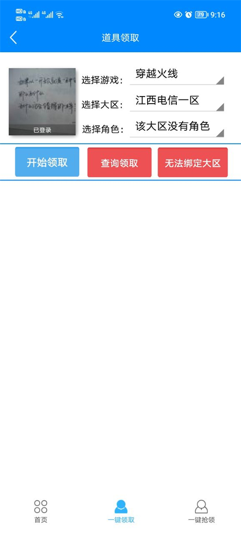 2、登录完成之后选择大区和角色信息之后点击开始领取。