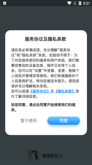 1、首先打开猜歌达人红包版2024最新版,同意用户协议