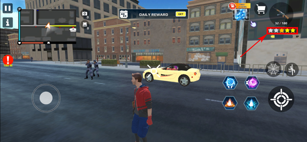9、如果我们犯罪了或者击杀了路人都有可能会被警察追捕,右边的小五角星会变红,当变成五颗星之后,会发动最强的追捕。