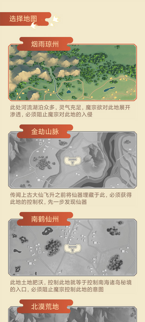 1、开局即可选择地图,拥有烟雨琼州、金劫山脉、南鹤仙州、北漠荒地、灵墟州等几个地图可以选择,每个地图都有不同的特点,只有通关上一个地图,才能解锁新的地图