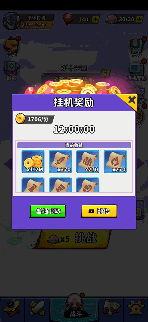 挂机与离线收益,是少侠大量获得装备升级道具以及金币资源的重要渠道。每次离线收益最高可以收取12小时,每次可获得1.2M金币收益。并且少侠挂机时,每分钟可产出1706金币收益,少侠可通过频繁上线或者攒足12小时,来收取挂机金币收益。挂机离线金币收益是少侠简单高效获取金币资源的有力方式。
