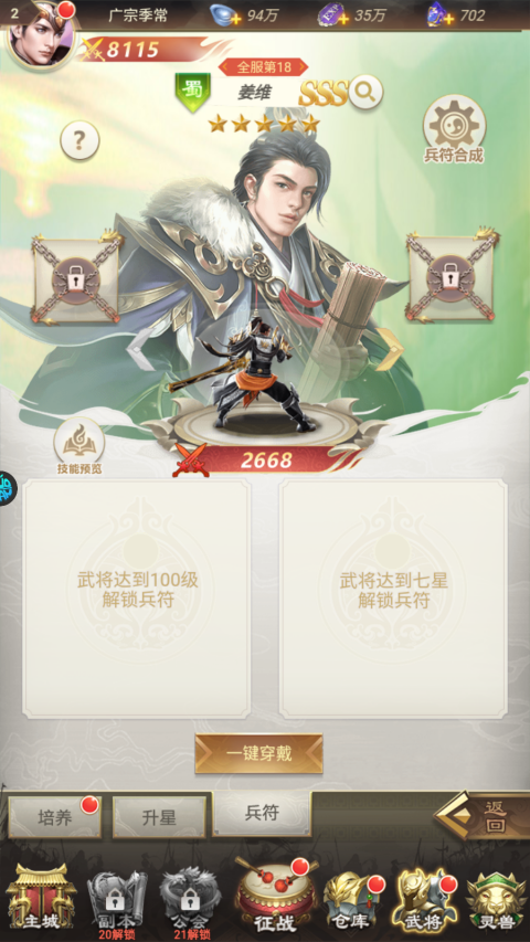 6、兵符——兵符可以给武将带来特殊技能,技能分为初级、中级、高级三种,每个武将可以装备两个兵符,武将到达100级解锁第一个,武将到达七星解锁第二个。