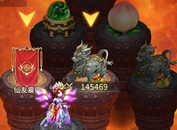 进入幻境后会随机刷出各式奖励与敌人,我们可以通过点选画面上的图像来选择通关路线。每个图像所代表的结果都不相同,其中麒麟图像代表敌方NPC的队伍及战力。红色旗子可以雇佣一个助战的伙伴,助战伙伴可以在布阵时上场。蟠桃可以使所有存活的伙伴恢复30%生命值。金丹可随机复活一位已阵亡的伙伴并回复其70%的生命值,如果没有阵亡的伙伴则回复生命值最低的一位伙伴100%生命值。黄金色小车代表幻境游商玩家可以用元宝购买各式道具。