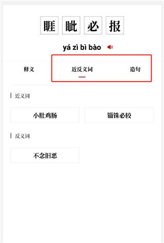 查询结果的组词、成语、近义词、反义词可以直接点击进行查询,实现深度化查询,帮助更深刻的理解。