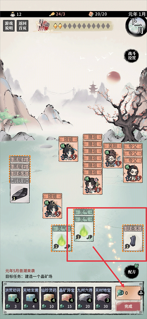 ㉒升仙台:人物3,仙木3,太玄石3,百炼钢2,广寒铁2,晶玉2,行动点3