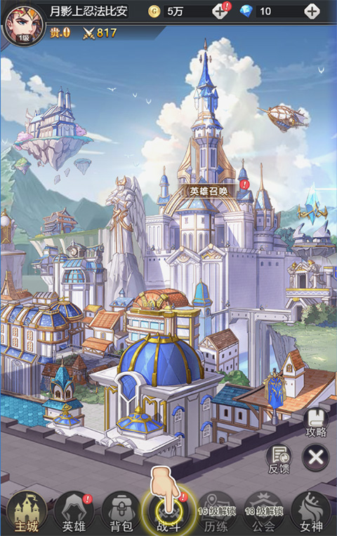1、打开女武神之剑手游官方版,进入游戏主界面,包括主城、英雄、背包、战斗、历练、公会、女神等选项,我们下方【战斗】选项,