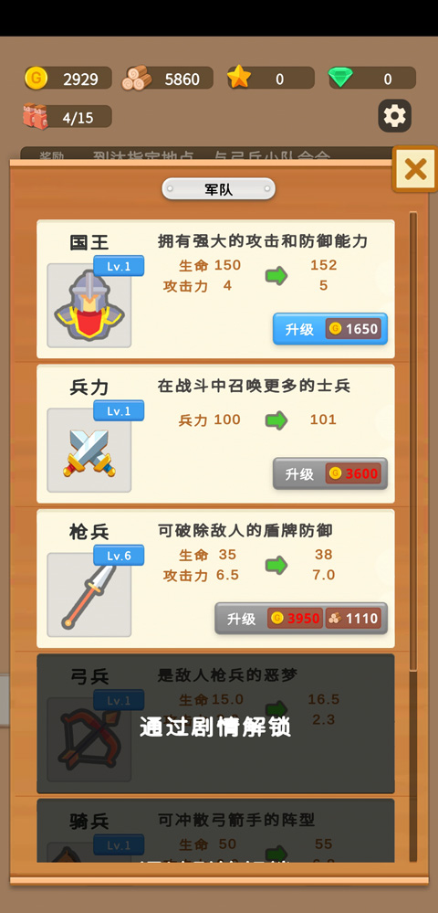 3、点击升级,即可提升以解锁的兵种,让其获得更强的生命与攻击力
