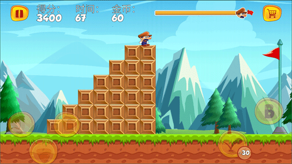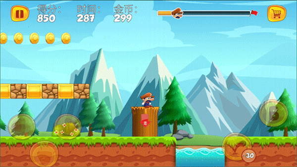 1、顶蘑菇游戏玩法跟超级玛丽相差不多,进入游戏后,左边三个按钮控制角色移动,右边分别控制角色射击和跳跃;