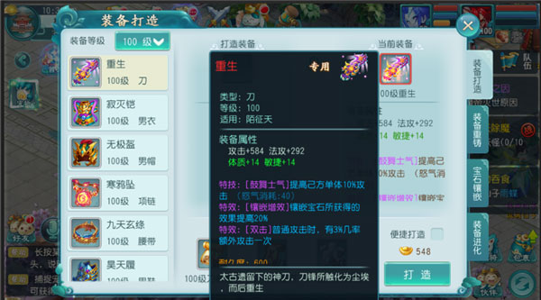 1、装备打造:可打造不同等级的装备,消耗掉不同等级的材料可打造出不同等级的装备。如果材料不够,可使用便捷打造,直接花费一定量的元宝来打造该装备。