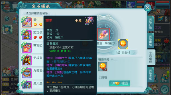 不同类型的装备可以镶嵌不同类型的宝石来增加人物属性,提升人物战斗力。