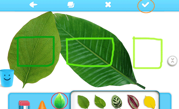 2、点击红色圆圈内的绿叶,左右滑动可以看到后面还有很多,点击你想要的绿叶,它就会到达纸上,然后你只需要拖动它到满意的位置就行了(完成后可以选择保存到“我的画廊”,点击蓝色圆圈内的按钮)。