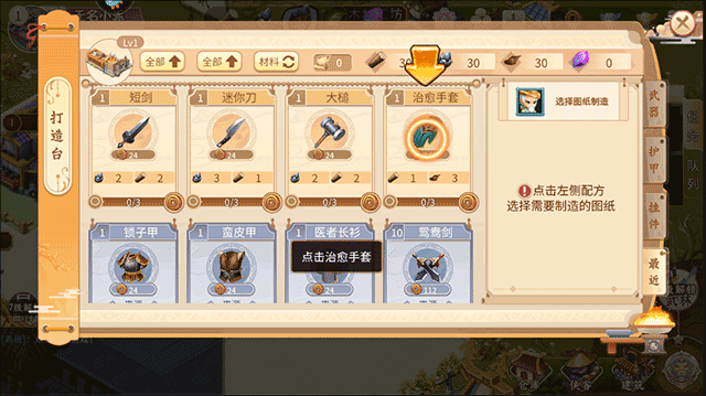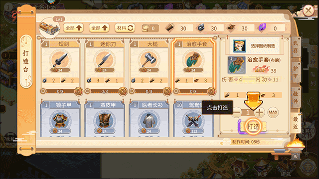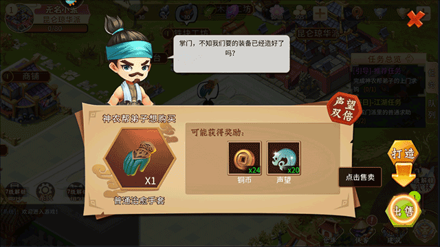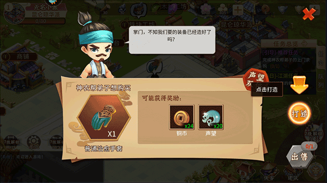 1、装备打造:多种装备配方可以研究和打造,让门下弟子打造,并在商铺出售,以获得门派资金。