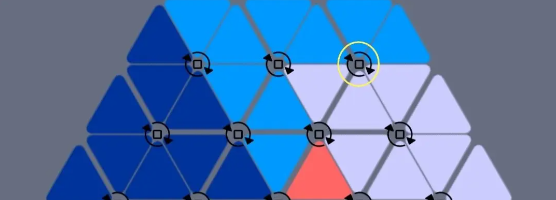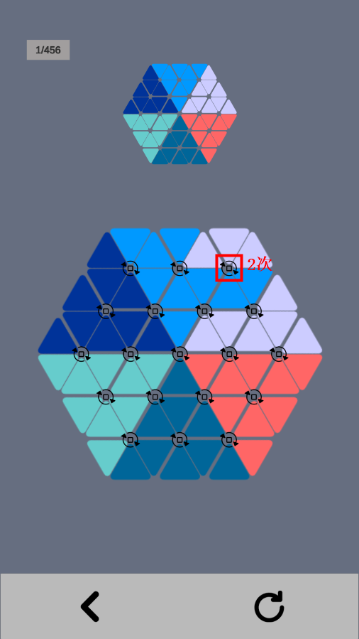 9、在后期关卡杂乱无章时,还原最好一个一个三角形按顺序来,否则有可能出现未还原大三角夹在两个还原大三角里面,除非破坏一个否则无法还原。