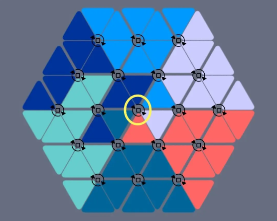 每次点击节点旋转其实是旋转此节点所接触的六个三角(即以节点为中心的正六边形);
