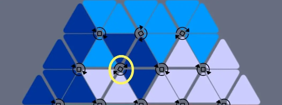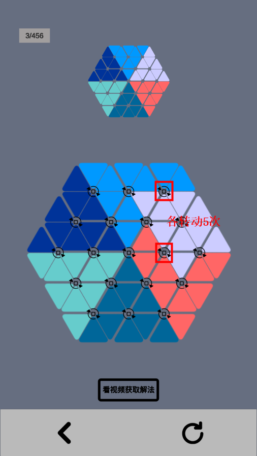 2、注意转动是根据箭头方向,顺时针转动的,每转动一次,周围的三角格子就会跟着移动;