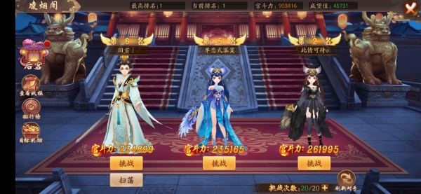 凌烟阁中通过挑战其他高排名的玩家获得其排名位置。高排名可开启后宫玩法和解锁高 级官品的职位。挑战玩家消耗挑战次数,挑战次数可消耗元宝购买。每天有20次挑战 次数,每天凌晨五点重置恢复挑战次数至上限。在凌烟阁可通过战报查询竞技信息。