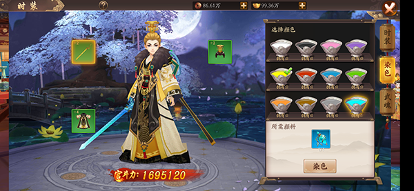 每件时装可染12种颜色。可任意搭配发型、衣服、武器的颜色,同一件时装,只能同时保存一种颜色。穿戴时装可激活时装属性,属性对所有上阵护卫有效。