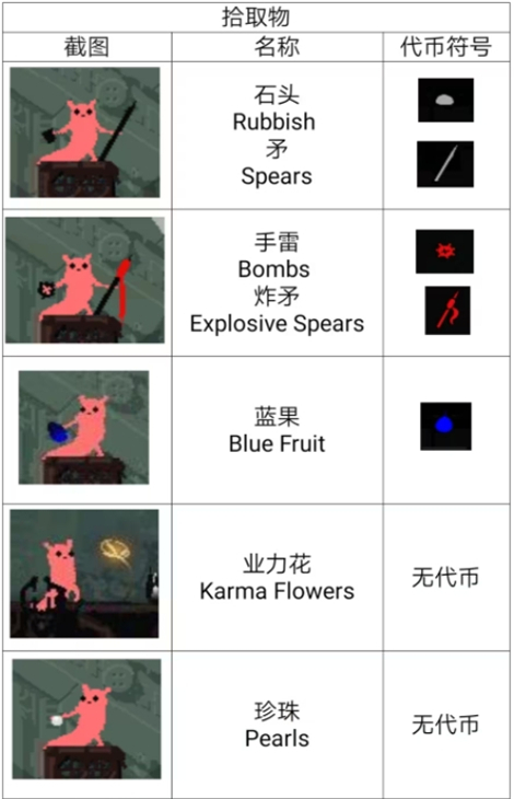 石头与矛:随处可见的物品。石头不会造成伤害但是会对生物产生硬直,对蜥蜴可以把头打转向;矛则是最基础的攻击方式,也会造成一定的硬直。