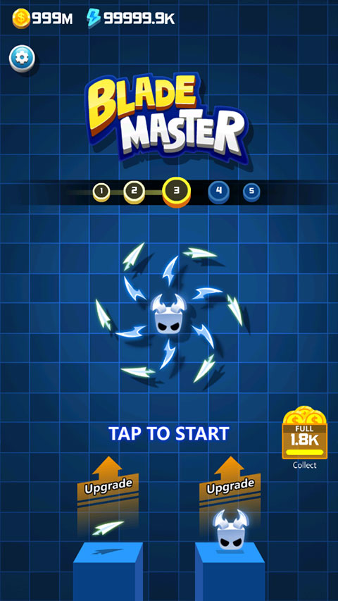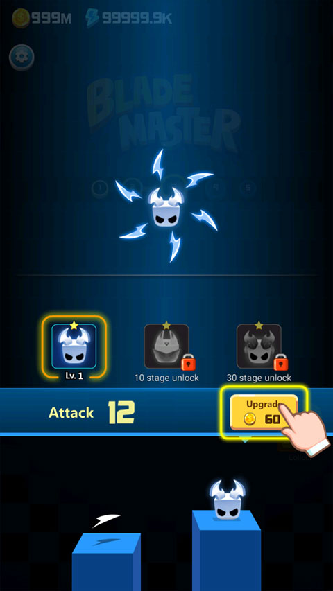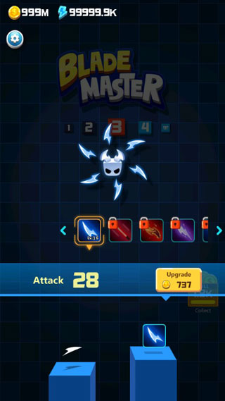 操作上没什么难度,主要是要收集锋利的刀片攻击敌人,让自己走得更远,找到更多宝藏和奖励。金币可以用来解锁各种英雄角色、升级技能和刀片。飞镖还能内外两侧同时培养,外侧飞刀升級后造型会变酷,而内侧飞刀则需要打到更高关卡才能解锁更炫的款式。