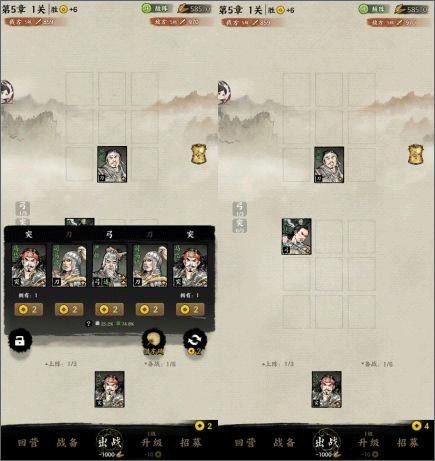 1、 备战状态:招募与上阵。进入主线关卡后,点击界面中的【继续】按钮即可开始进行关卡战斗。点击【继续】按钮后,即进入备战状态。备战状态会首先弹出招募窗(如下图一),主公需要根据自身所有拥有的军饷(沙盒资源)数量来招募对应的武将。