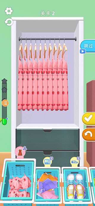 【游戏玩法】 进入游戏后,你将看到等待整理的各种衣物。需要将这些衣服、袜子、鞋子等物品合理摆放到衣柜中。选择好要摆放的衣物后,点击衣柜进行整齐放置。毛巾和袜子等小件物品则可以放在下方抽屉里。完成所有物品的摆放即可进入下一关。