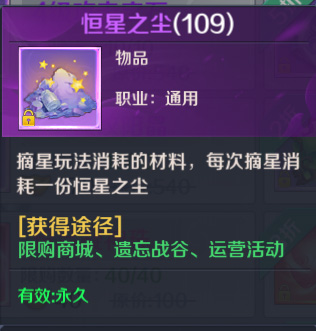 4、摘星的必备门票是恒星之尘,每次摘星都需要消耗一个,恒星之尘来源于遗忘战谷副本掉落和商店售卖